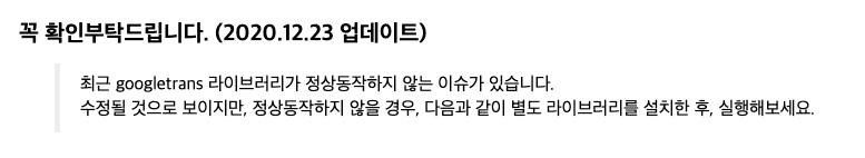 안녕하세요. 혹시 이게 어느 챕터에서 몇분 몇초에 일어난 일인지를 알려주신다면, 좀더 저도 정확히 말씀을 드릴 수 있을 것 같은데요. 제가 아마도 라이브러리를 설명하는 챕터에서 재미잇는 라이브러리로 번역 라이브러리 예제를 보여드리면서, 해당 챕터의 자료를 다운받아보시면 해당 자료 하단부에 해당 라이브러리가 정상동작하지 않으면, 다음 라이브러리를 다음과 같이 설치/실행해보시라고 가이드를 상세히 드렸거든요. 이 부분을 한번 확인해보시면 어떨까요?
