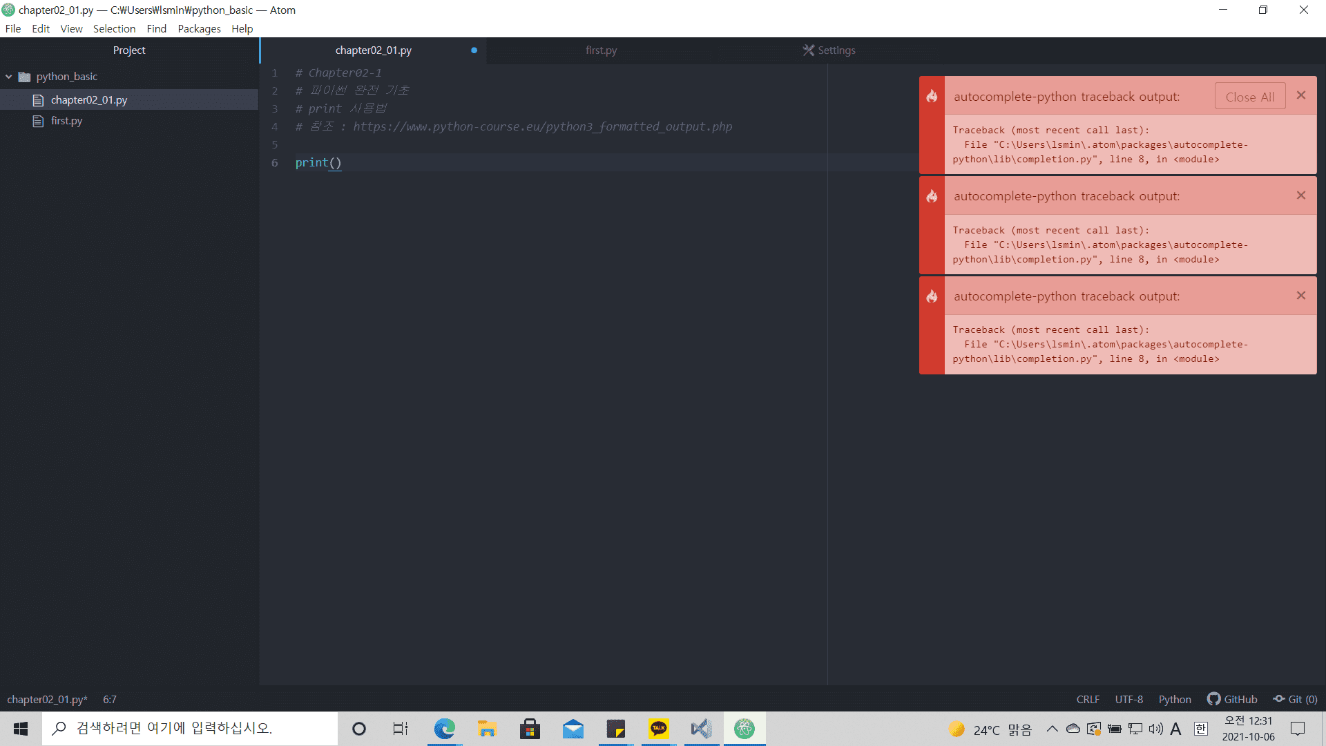 파이썬 처음 시작하고 열심히 따라해보려고 하는데 처음부터 이런 오류가 계속 나와요.. 뭘까요..?
