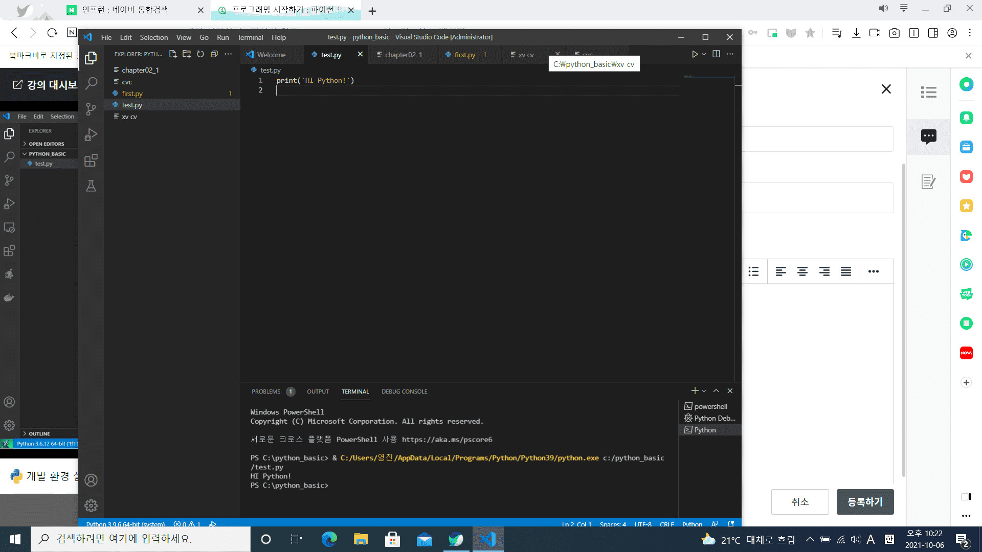 파이썬 기본 환경 설정(2-1) : 개발 환경 설정(Vscode) - Windows