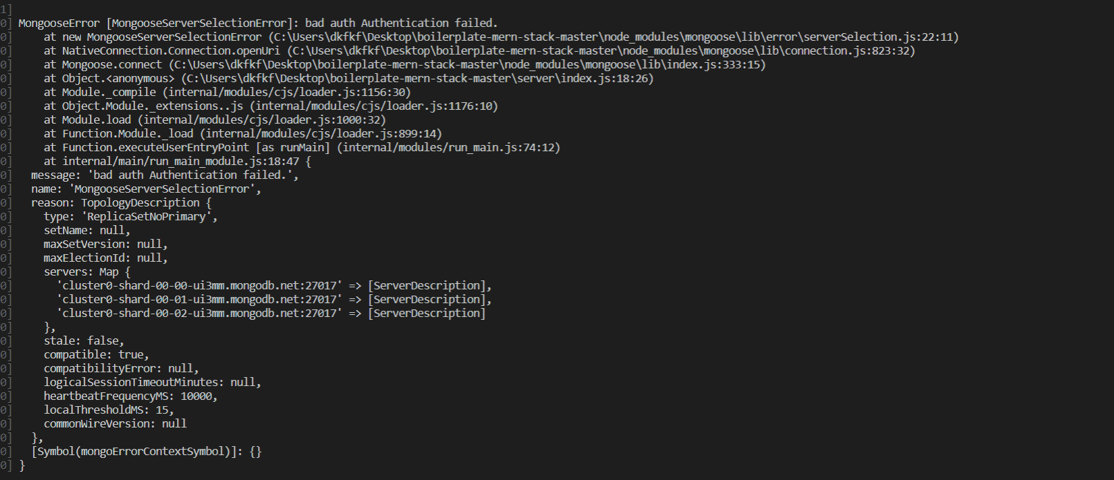 위에 문제는 해결되었는데  계속이렇게 뜨면서 에러가 나네요ㅜㅜ mongodb 아이디와 비밀번호 문제일수도 있다는데 변경해서 다시해봐도 똑같은 에러가 발생합니다