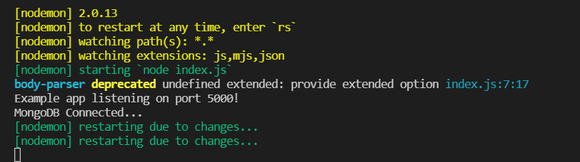 아래 스크린샷에서 코드를 저장하면 [nodemon] restarting due to changes... 만 뜨고 이후에
