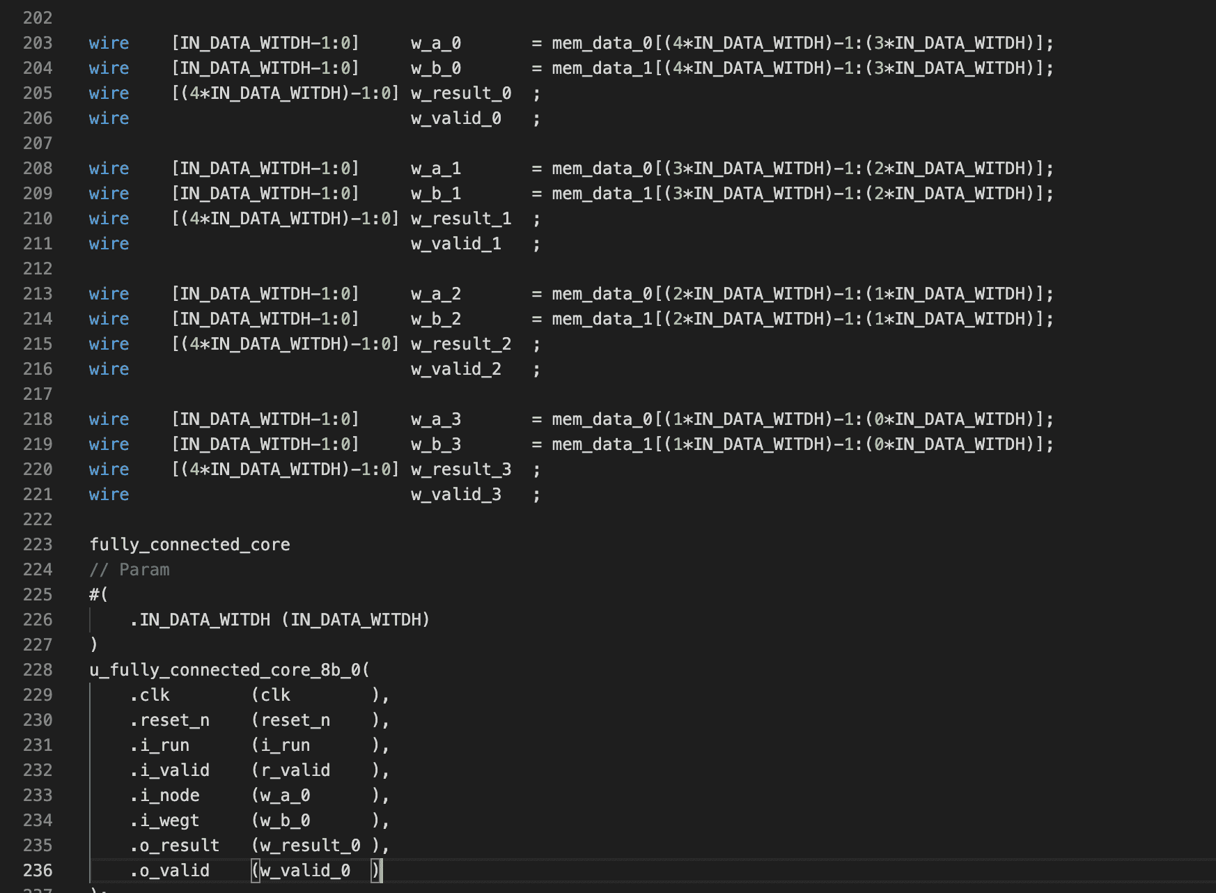 1. 현재는 4개의 core를 사용하기 때문에 일일히 코드 작성이 부담이 되지 않지만 실제 fc layer는 엄청 많은 node들로 이루어져 있기 때문에 일일히 일정한 규칙에 맞춰서 매 line을 적어주는 일은 비효율적이라고 생각이 드는데 혹시 이 상황에서 쓸 수 있는 문법이 있는지