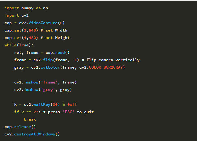 cap = cv2.VideoCapture(0) cap.set(cv2.CAP_PROP_FRAME_WIDTH,640) cap.set(cv2.CAP_PROP_FRAME_HEIGHT,480) cap.set(cv2.CAP_PROP_FPS, 20)
