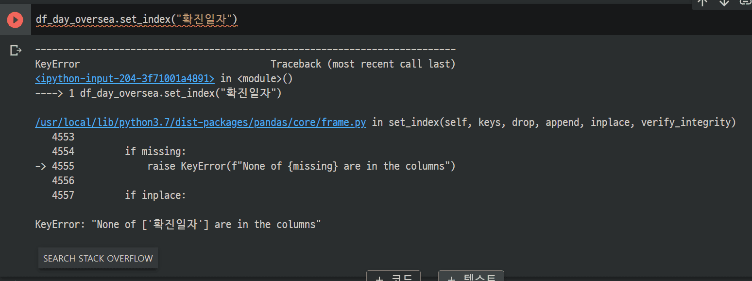 그래서 다시 해당 코드를 실행하게 되면 컬럼이 아닌 인덱스에 해당 컬럼이 변경되어 있기 때문에 컬럼에서는 해당 값을 찾을 수 없다는 메시지 입니다.