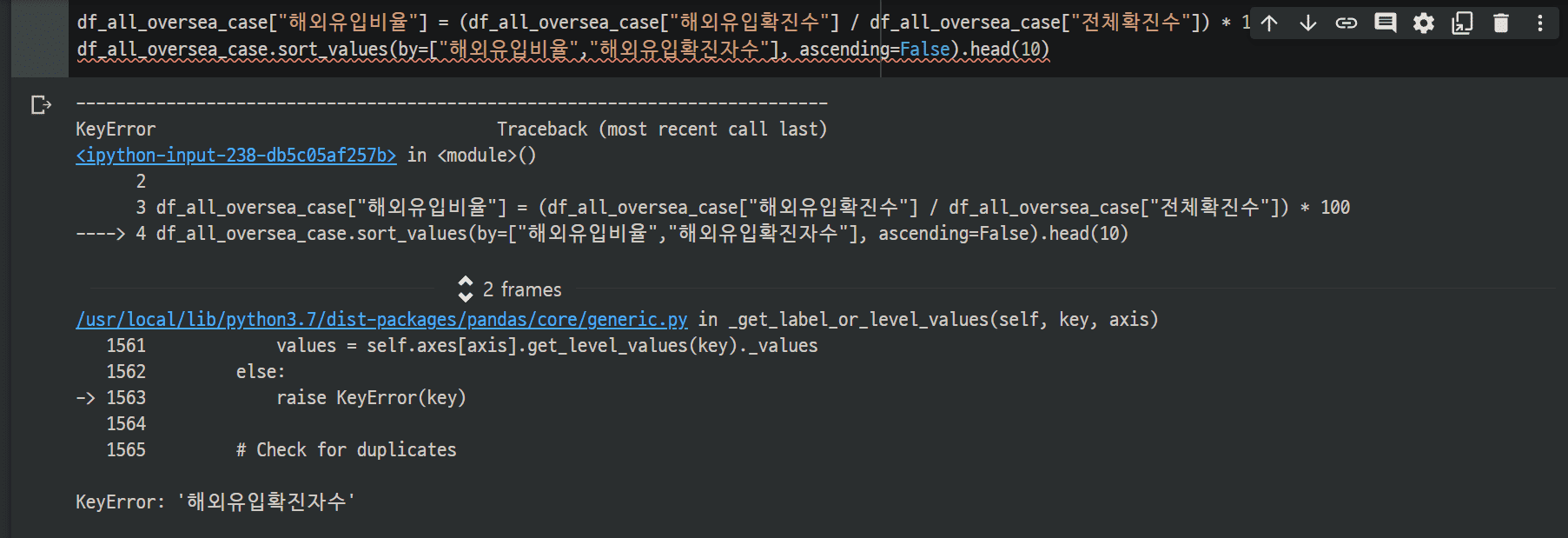 해외유입확진자 수 없어야하는건가요? 제가 코드 다쓰여진 파일가지구 실습하고 있는데 강의처럼 해외유입확진자수가 안쓰여져있길래 똑같이써서 돌렸더니 오류가 나서요!