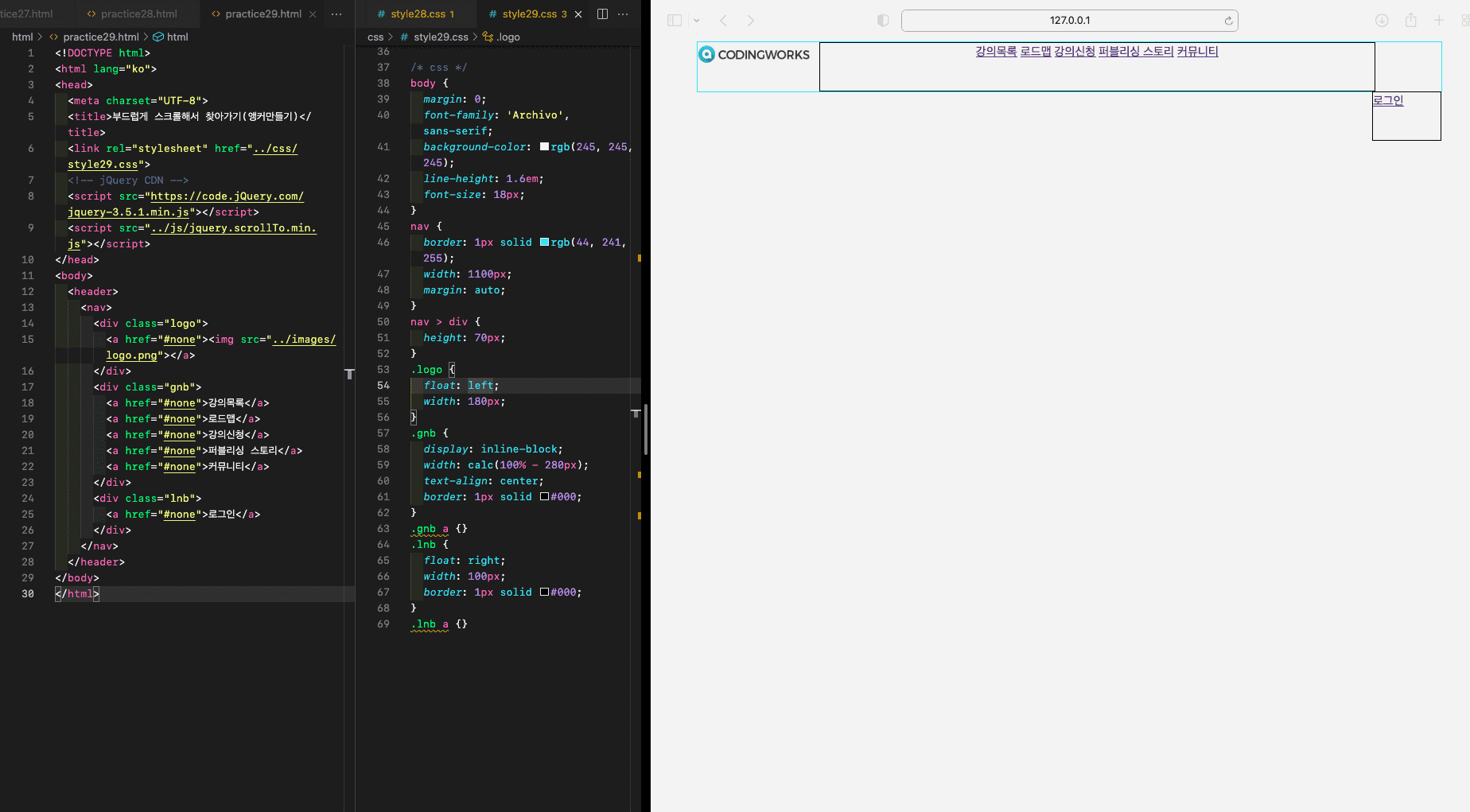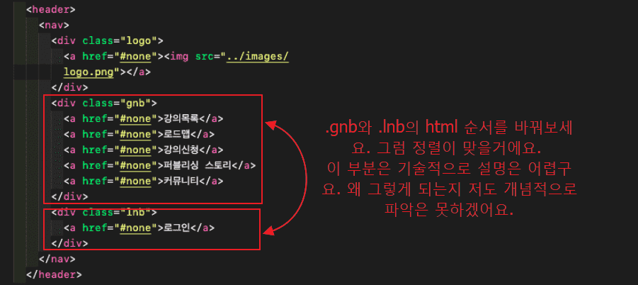 캡처보시면 아시겠지만, 강의따라서 코드 그대로 실습하며 따라하고 있는데, .lnb 부분이 자꾸 nav 에서 삐져나와 하단에 머물러있네요. ㅠㅠ