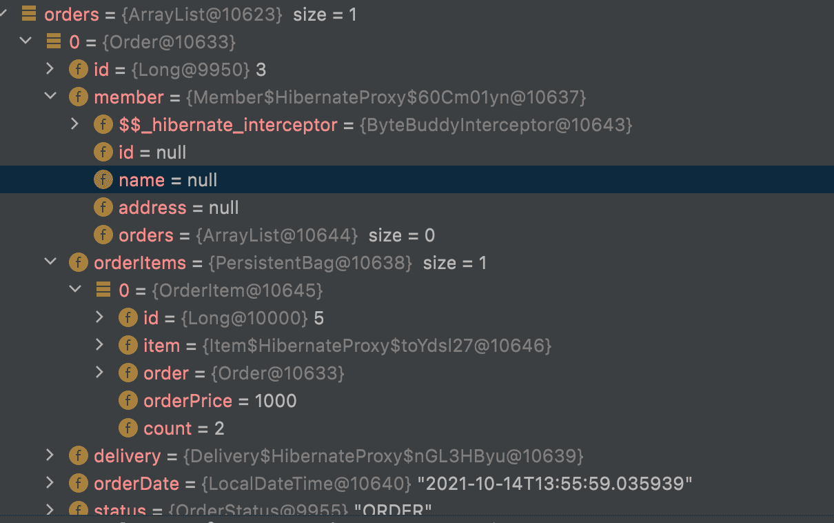 oders 안에 member 객체 내의 모든 컬럼이 null 로 세팅 되어있는데 어떻게..