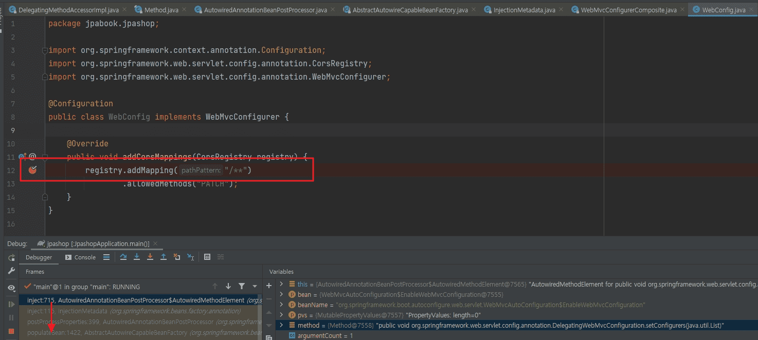WebMvc 설정 관련된 것들을 가지고 있는 목록을 돌면서 addCorsMappings()을 호출합니다. 해당 목록에는 WebConfig이 들어있고요.