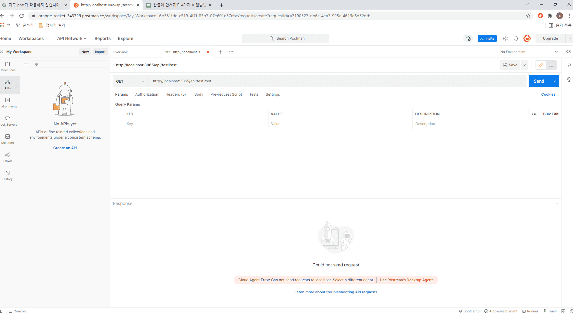 get도 안되는데요? 지금보니 브라우저 포스트맨으로 하시는데 브라우저 포스트맨은 로컬호스트 접근 못합니다.