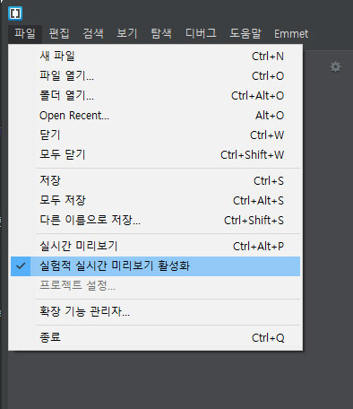 그리고 블라켓 메뉴에서 [파일] > [실험적 실시간 미리보기 활성화]를 체크해주세요.