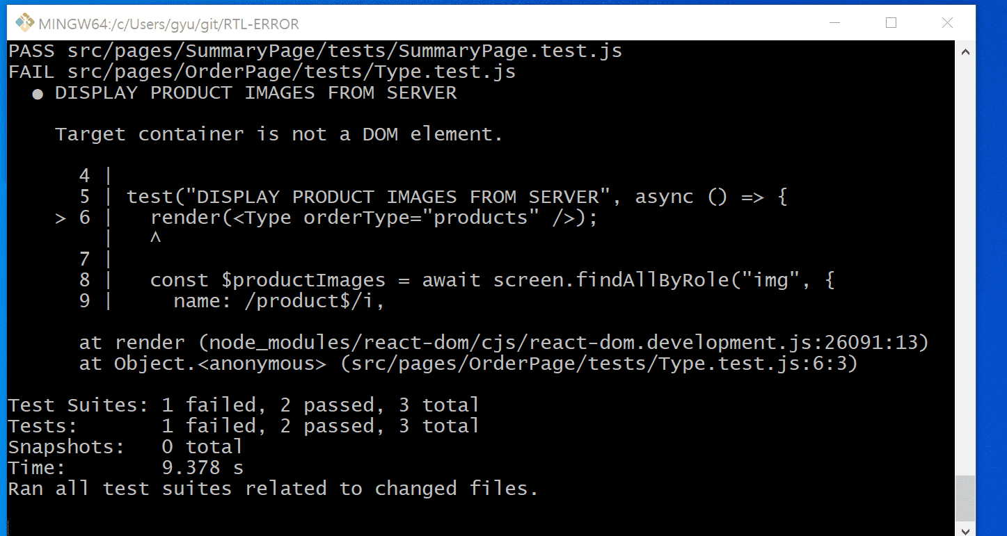 해당 과정 마지막 즈음에 테스트 코드를 작성하고 테스트를 확인하는데 해당 테스트 부분에서 에러가 발생합니다.