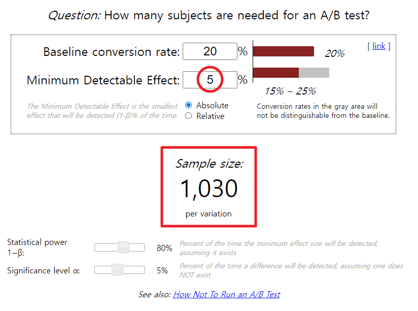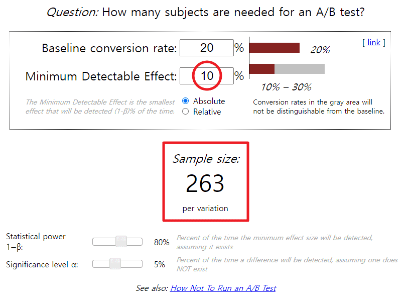 detectable effect가 커지면, 샘플 사이즈는 작아집니다. (아래 이미지를 참고하세요~)