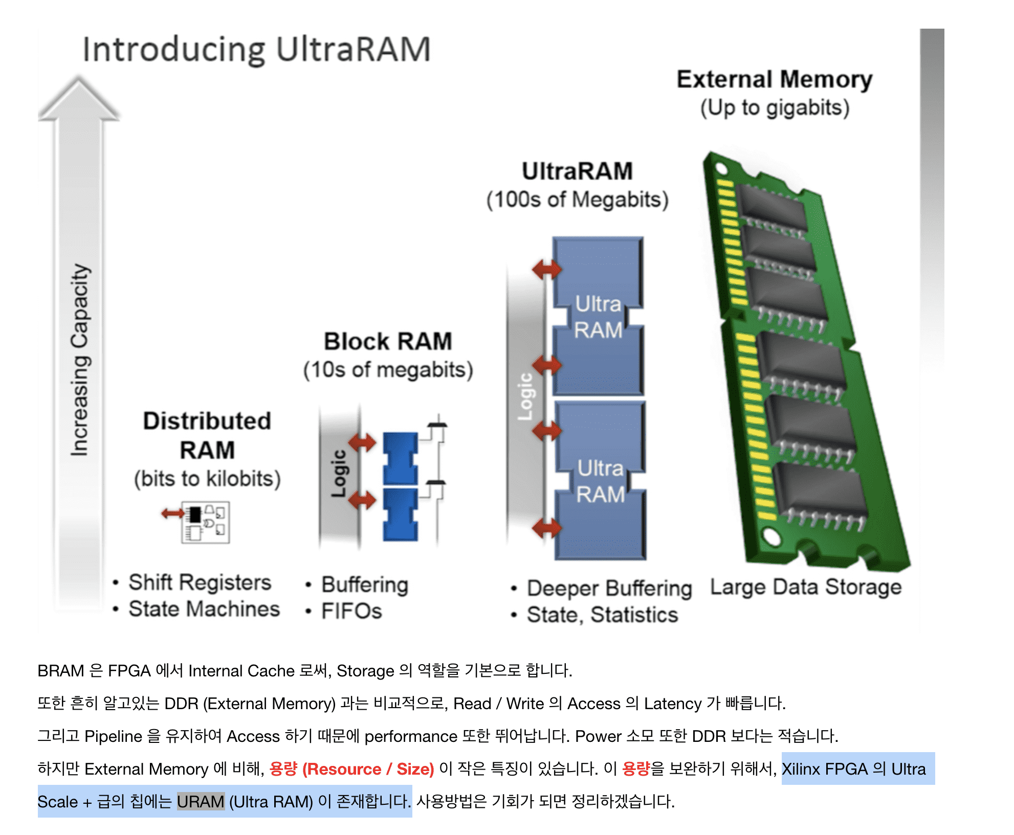 맞습니다 :) 더 좋은 FPGA 에는 URAM 이란 것도 있어요. 둘다 여의치 않다면 DDR 을 사용해야합니다.