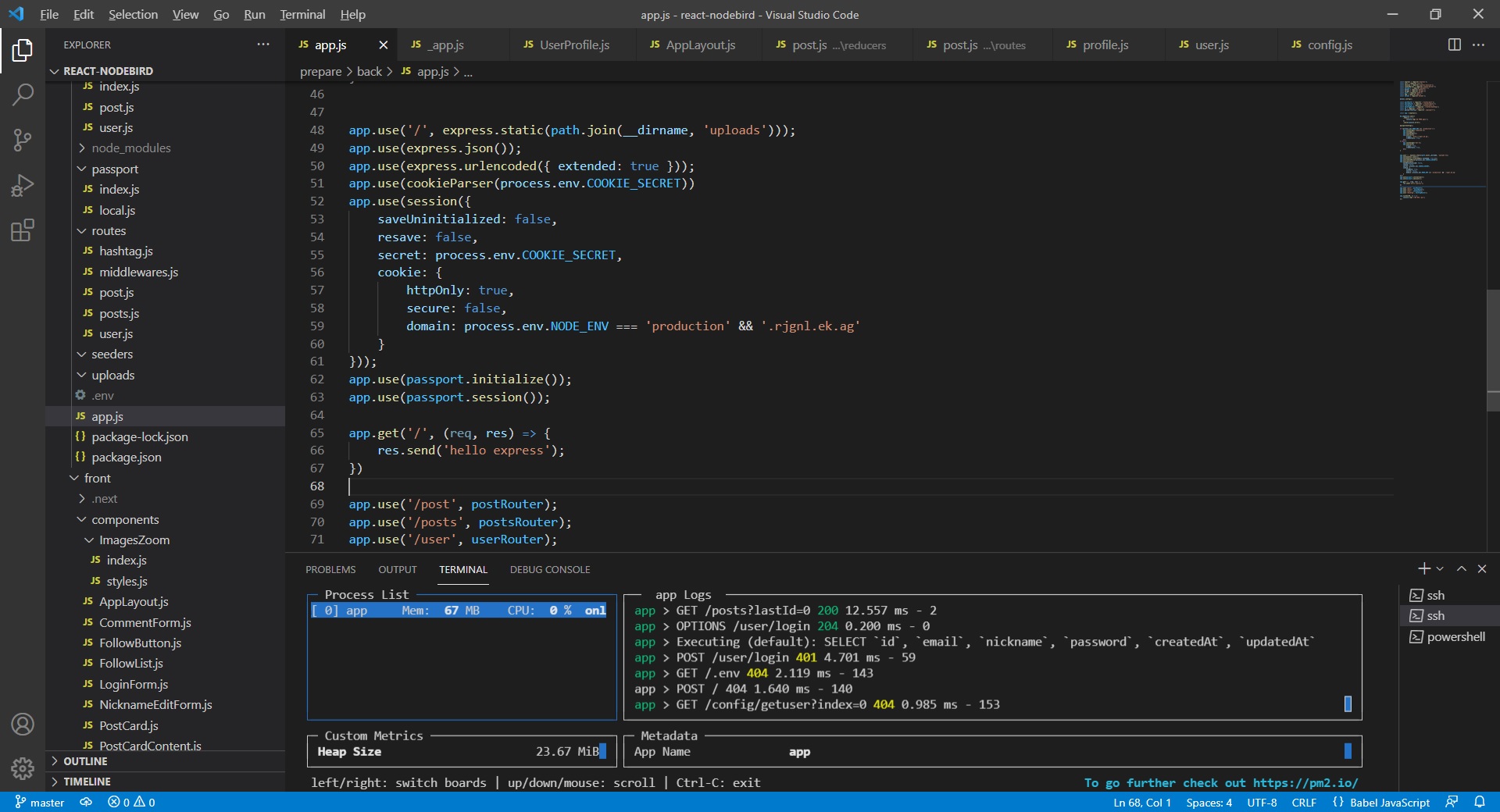 이 코드를 app.js에 넣은 후 다시 배포 후 서버 재실행(pm2 reload all) 해서 첫 서버 시작 시 어떻게 콘솔에 찍히나 확인해주세요.(pm2 monit)