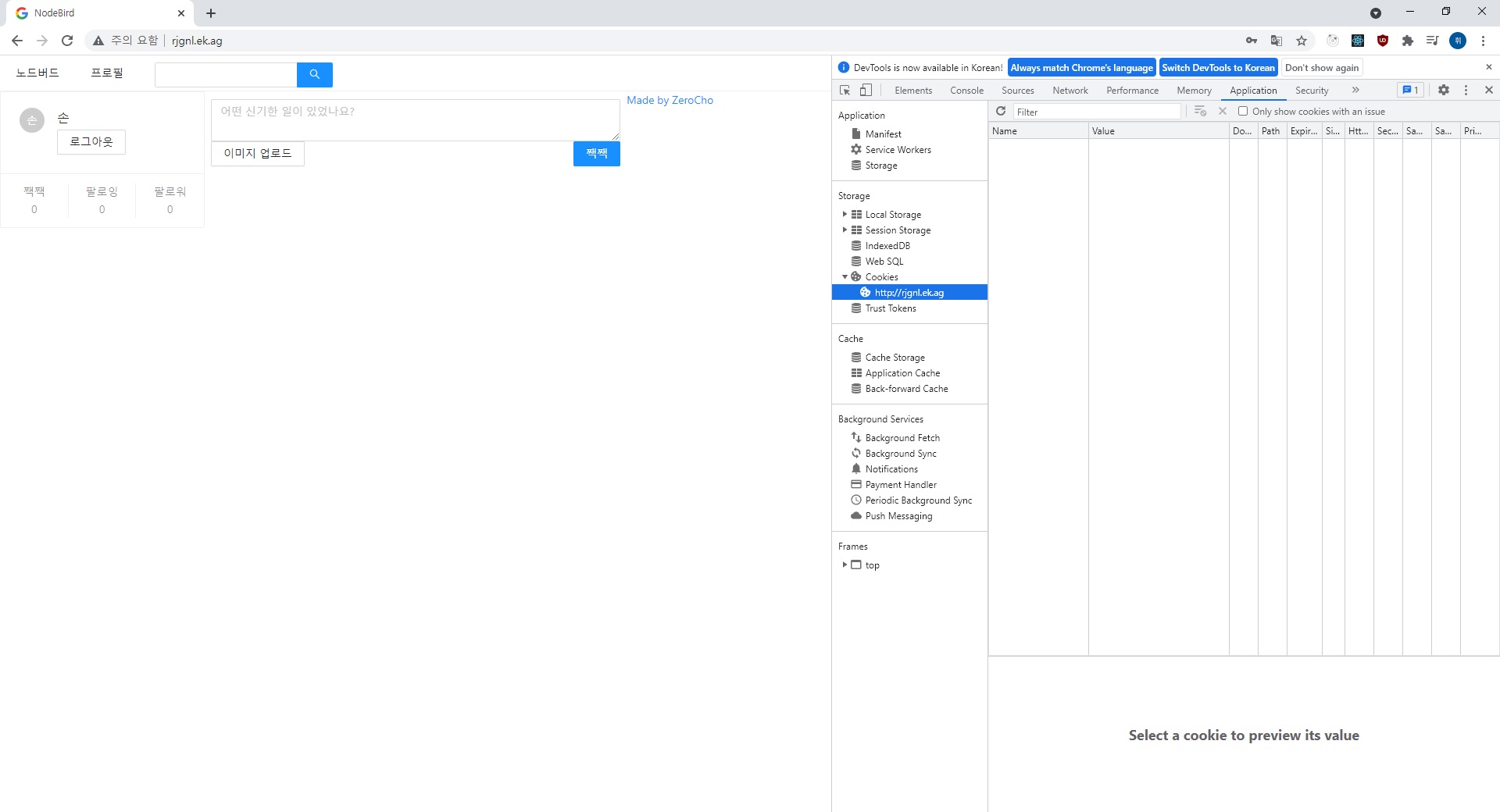 application cookies에는 로그인 성공시에도 쿠키 정보가 들어가있지 않은 상태입니다.