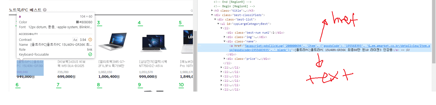 분명히 그 사이트에서 F12로 개발자모드가서 보면 href라는 속성도있고, 또 그 태그에 해당하는 글도 있는데...