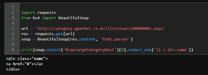 print(soup.select('#cppLargeCategoryBest')[0].select_one('li > div.name'))