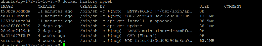 제가 이해한것이 맞다면, 제 화면에서 docker history myweb을 한 결과, ubuntu설정 부분에서 강의 3:04부분의 강사님의 docker history myweb의 히스토리와 제 히스토리와 비교해 제것은 너무 조금의 이미지가 사용이 된 것 같아 캡쳐사진 올립니다.
