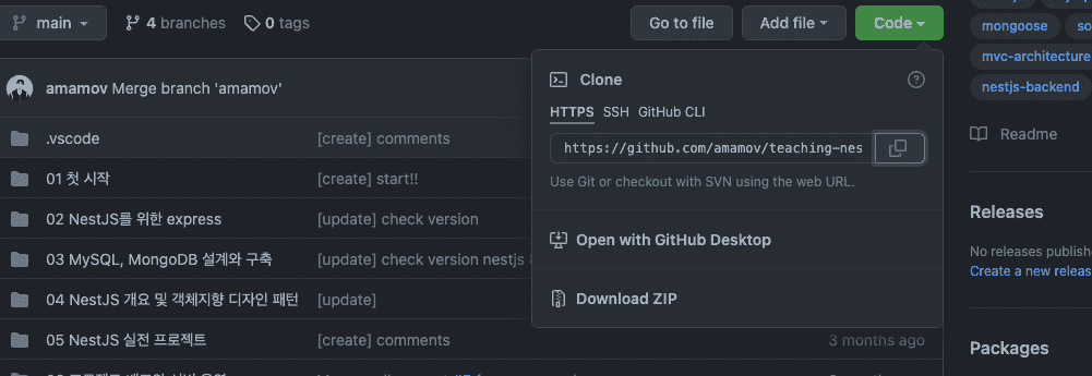 그냥 터미널에 "git clone https://github.com/amamov/teaching-nestjs-a-to-z.git" 하시면 github 레포를 다운받을 수 있습니다. 깃을 사용하신적 없으시면 아래 사진처럼 깃헙 레포 들어가셔서 "Code" 버튼을 누르고 "Download ZIP" 버튼을 눌러서 압축 파일로 코드를 다운 받으셔도 됩니다.