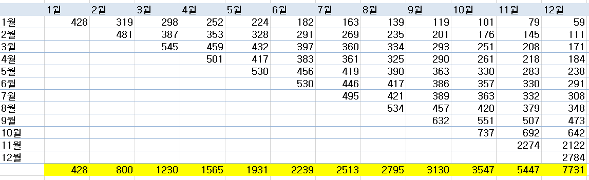 그렇다면, 선생님이 남겨주신 표의 월별 잔존회원의 sum은 (2019년 1월에 가입했다가 1월까지 잔존한 사람 수 + 2019년 1월에 가입했다가 2월까지 잔존한 사람 수 + 2019년 2월에 가입했다가 2월까지 잔존한 사람 수+ 2019년 2월에 가입했다가 3월까지 잔존한 사람 수 + ...12월까지 반복...)인데,