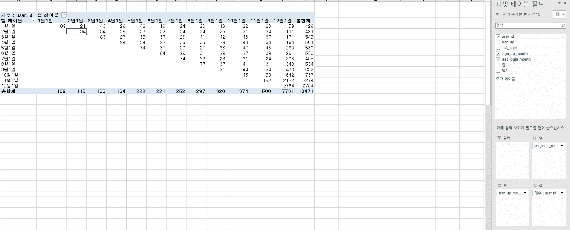 선생님은 가입한 월(행) 과 마지막 로그인 한 월(열)로 monthly active user 를 설명하셨는데요.