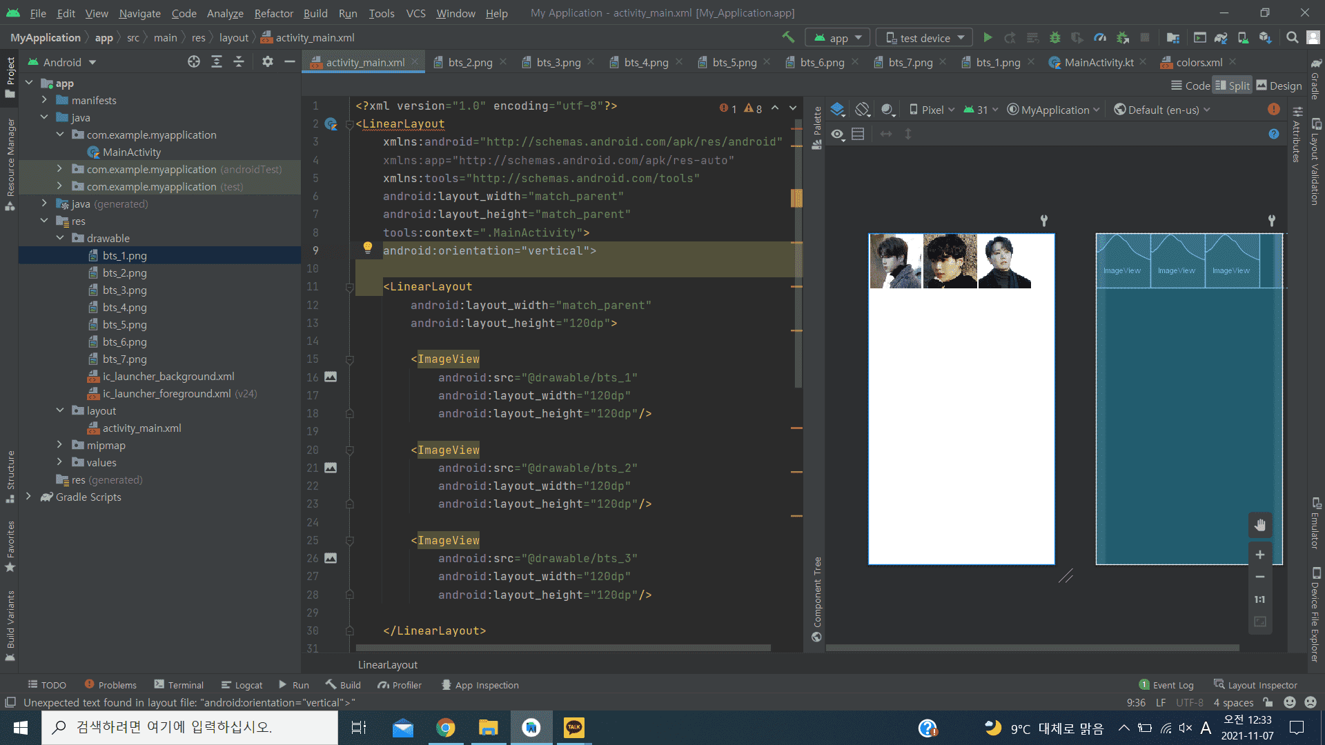 아뿔싸..윗줄에 이미 LinearLayout에 대해서 >로 닫혀있었고