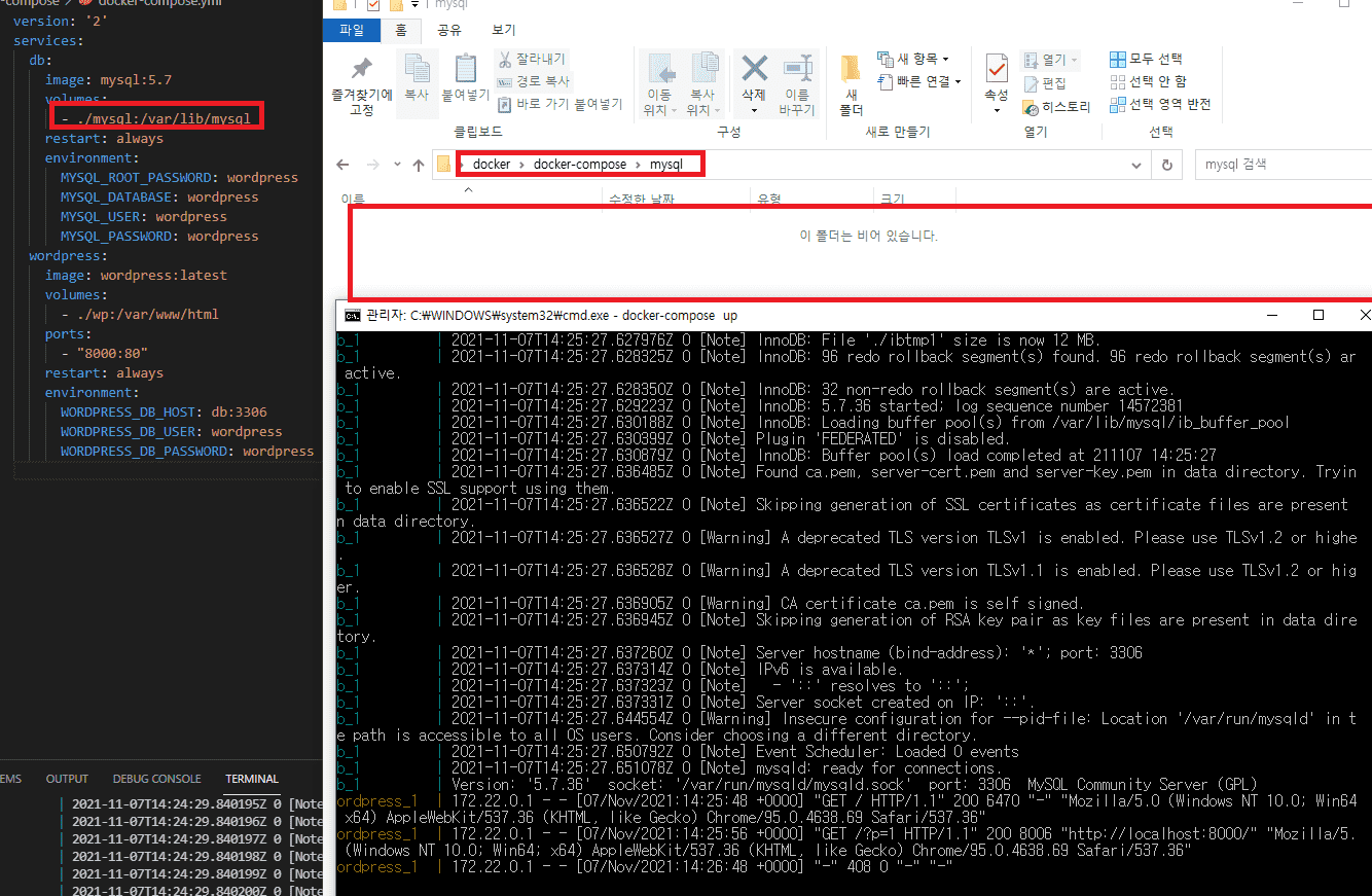 아래첨부파일을 보시면 네모친 경로에 볼륨으로 연결해놨는데 왜 MYSQL관련 파일이 로컬 PC에 생기지 않는걸까요?