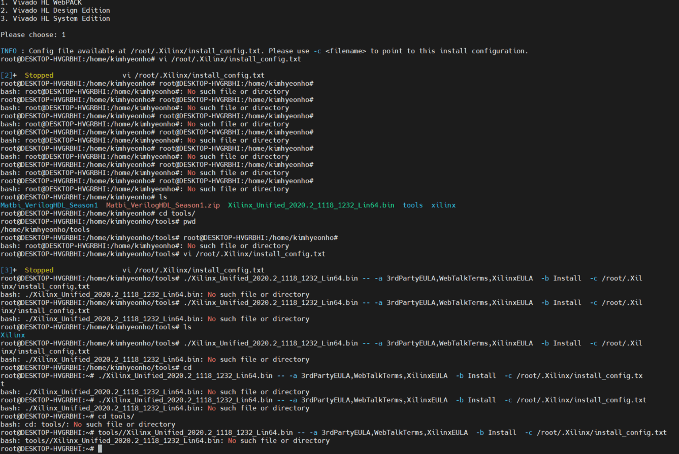 홈 넣고 vi /root/.Xilinx/install_config.txt 넣어서 편집하는게 어렵네요 창 열리고 바뀌지가 않아서 다음 단계의 명령어를 넣어도 설치가 되지 않습니다. 그리고 1을 0로 바꾸는 방법도 나와있지 않네요 ㅜㅜ