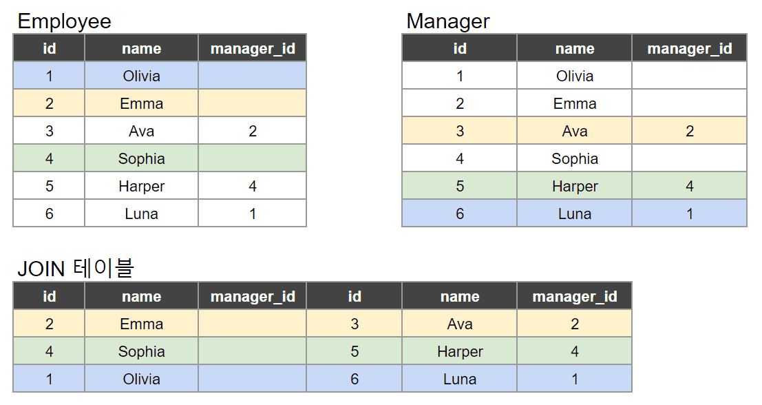예를 들어 예시에서 3번 사원인 Eva의 매니저는 2번 사원인 Emma인데요. 지금 짜주신 쿼리에 의해 manager테이블에서 manager_id를 가져오고 Employee 테이블에서 id를 가져오기로 한다면 이름과는 거꾸로 Employee 테이블에는 매니저들의 이름이 들어가게 되고 거꾸로 Manager 테이블에는 Employee들의 이름이 들어가게 됩니다.