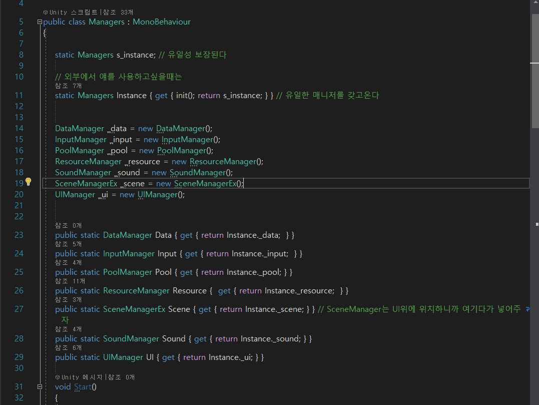 1.현재 static Managers s_instance;로 한정자를 두어 오로지 Managers. s_instance 로만 접근이 가능하도록 만들어 두었습니다.(..맞나용..?)