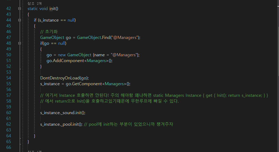 2. 그리고 static Managers Instance { get { init(); return s_instance; } } 이코드의 말뜻이 return 으로 s_instance를 가르키니까 init()함수를 실행하고나서 Instance라는 프로퍼티는 결국 s_instance를 가르키는 말이 되는것인가요??