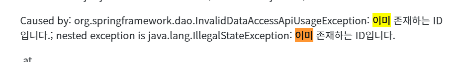 Caused by: org.springframework.dao.InvalidDataAccessApiUsageException: 이미 존재하는 ID입니다.; nested exception is java.lang.IllegalStateException: 이미 존재하는 ID입니다.