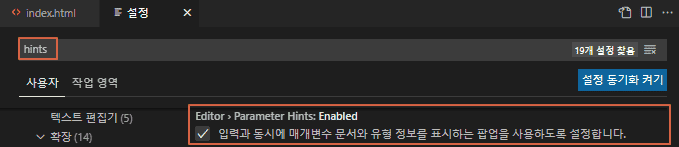저는 체크되어 있는데 코드힌트가 안나오네요. 왜 안나오는지 구글링을 좀 해야 할 것 같아요. 다른 설정을 건드린게 없는데 갑자기 코드힌트가 안나오네요. 아마도 질문자께서도 저와 같으실 것 같아요. 해결방법 찾으면 다시 답글 달도록 할게요~