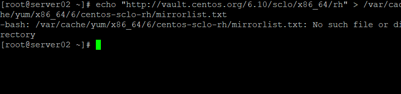$ echo "http://vault.centos.org/6.10/sclo/x86_64/rh" > /var/cache/yum/x86_64/6/centos-sclo-rh/mirrorlist.txt