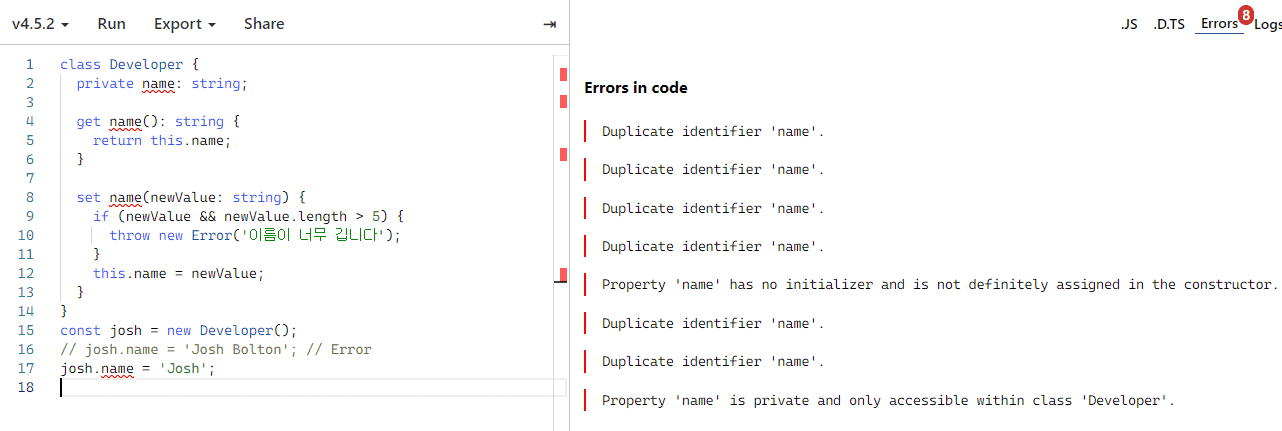 타입스크립트 playground에서 실행하였고, 아래와 같은 에러메세지가 나오고 있는데 이유가 뭔가요??
