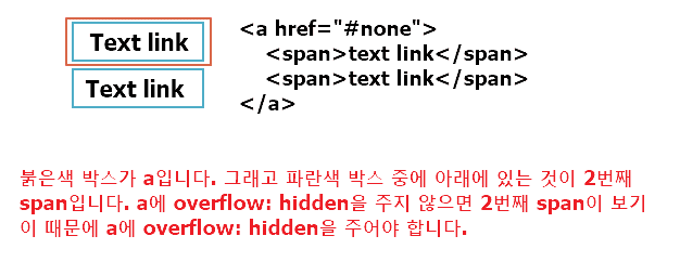 안녕하세요 선생님 강의 잘보고 있습니다 질문드릴게 있는데 overflow:hidden; 을 .gnb a 에 줘야 두번째 span이 감춰지는게 이해가 잘 안가는데 설명해주시면 감사하겠습니다