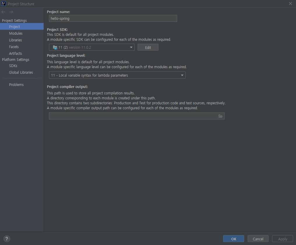 빨간색 박스의 JDK를 내가 새로 설치한 자바 11로 지정해줍니다.