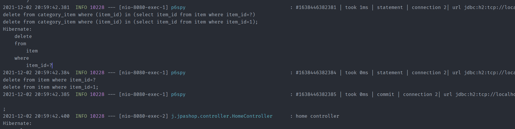 2021-12-02 10:27:11.237 INFO 14679 --- [nio-8080-exec-8] p6spy : #1638408431237 | took 0ms | statement | connection 18| url jdbc:h2:tcp://localhost/~/jpashop