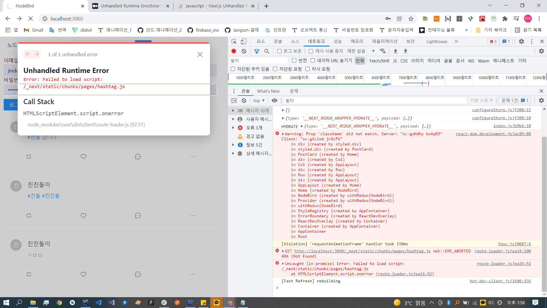 Error: Failed to load script: /_next/static/chunks/pages/hashtag.js 라는 오류페이지가 뜨고 2초정도 후 새로고침 한것처럼 에러창이 없어지며 해시태그 검색 결과페이지 로드되어집니다