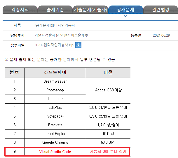 일단 아래 보시면 웹디자인 기능사 공식사이트인 큐넷에서 2021년 4회차부터 Brackets가 없고 Visual Studio Code가 설치되어 있다고 했습니다.