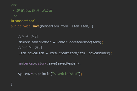 그리고 연관관계 편의 메서드를 아이템을 저장할 때 회원정보도 저장하게 했습니다.