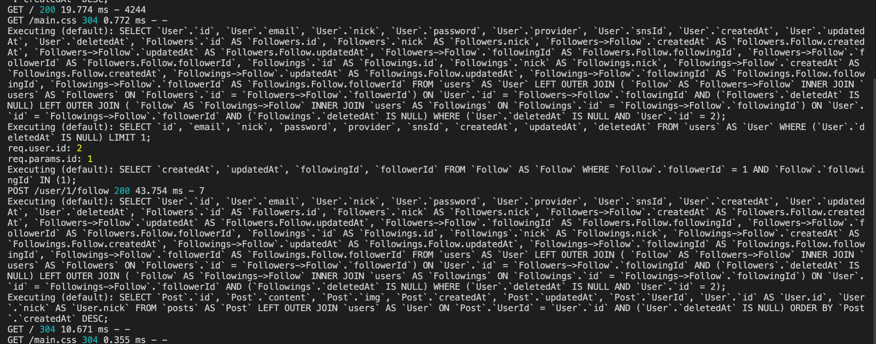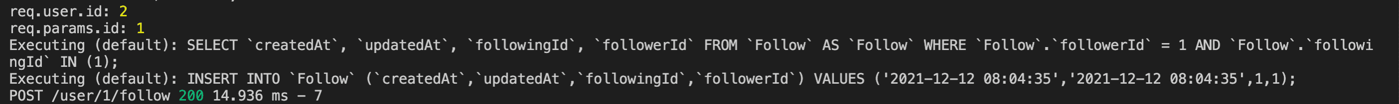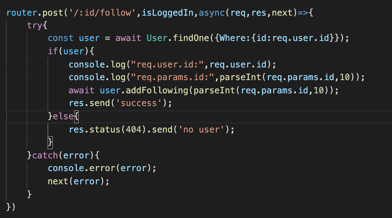 console로 찍어본 결과 현재 로그인 유저를 나타내는 req,user.id 2가 맞게 나오고, 팔로우 요청한 유저의 아이디를 나타내는 req.params.id 값도 1로 맞게 나오는 것을 확인했습니다.