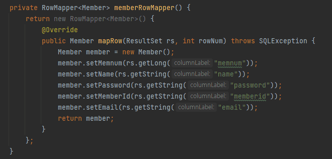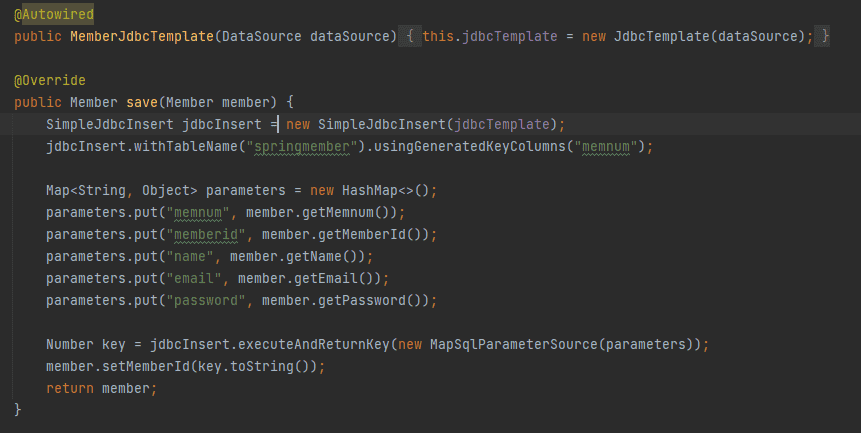 자동으로 증가하는 번호는 memnum, 이름, 아이디, 비밀번호, 이메일을 추가한 새로운 DB를 mysql로 만들고 이를 적용하는데 테스트코드에서는 memberid에 분명히 'spring12'를 넣었지만 정작 saveId에는 memnum이 입력이 되고 memnum은 아무것도 입력이 안되는 현상이 계속 관측됩니다. 그래서 계속 테스트코드는 오류를 뱉어내고 있습니다.