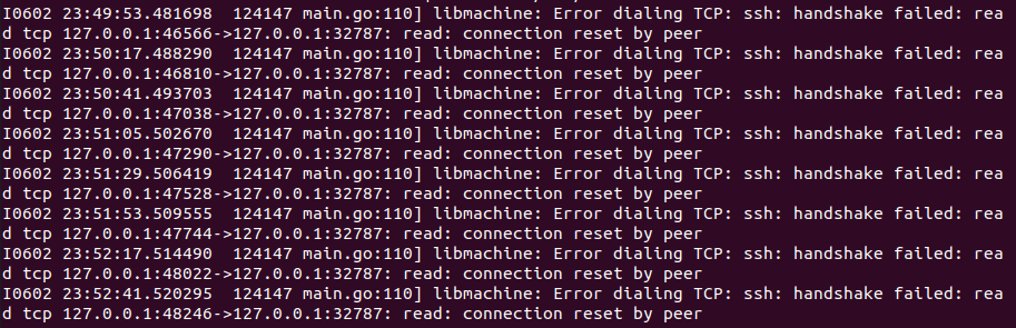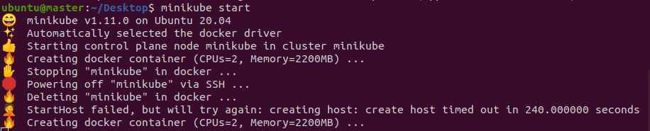 제가 눈으로 로그를 봐서는 컨테이너를 생성하고 쿠버네티스를 준비하는 과정에 들어가지 못한 상태로 죽는 것 같은데 혹시 가상 머신의 사양은 어떻게 되시나요? 제가 겪어 보지 못한 상황입니다만 검색되는 내용 대부분의 경우 VBox에 가상머신을 할당하지 못한경우에 해당 에러가 나오는 것으로 보입니다. 어떤 이유로든 충분한 자원을 할당하지 못해서 발생하는 것이 아닌가 조심스래 추측해봅니다. 자원을 좀더 넉넉히 주실수 있다면 한번 시도해보시길 부탁드립니다. 감사합니다.