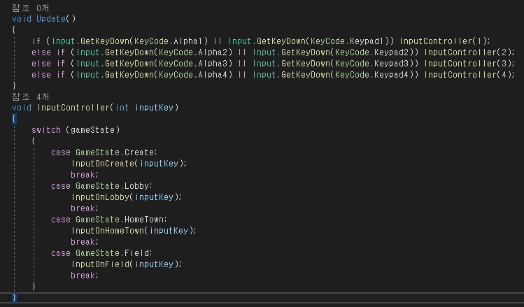 유니티에서 그런 기능이 무엇인지 몰라서 Update 함수에서 키 입력을 받아, 게임 상태(enum으로 캐릭터 생성, 로비, 마을, 필드, 전투 등으로 선언했습니다)에 따라 수행할 동작을 전달해주는 식으로 구현했습니다.