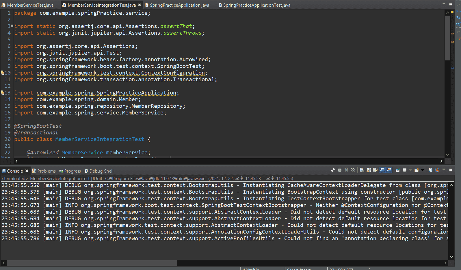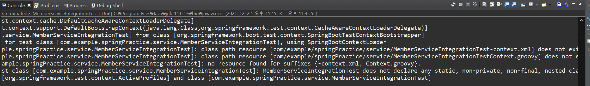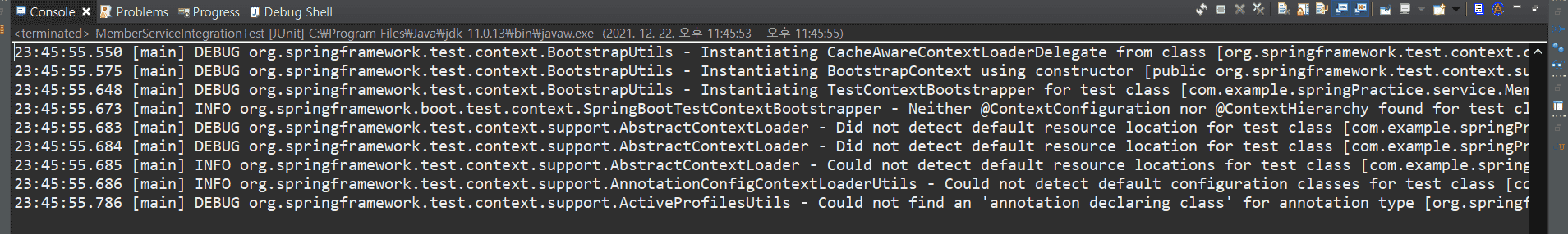jUnit테스트를 실행하였는데 왜 이런 디버그 메세지가 뜨는 지 이해가 안 됩니다.