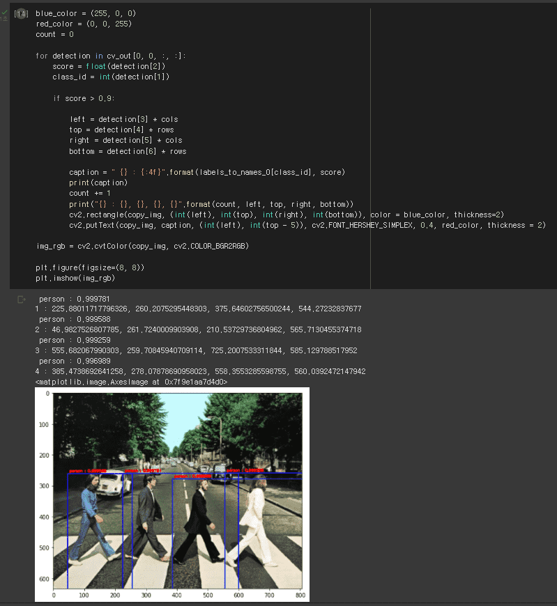 나온 좌표를 보면 두번째 사람의 bounding box에 대한 정보를 갖고 있는데, cv2.rectangle()를 통해 출력된 것을 보면 더해진 것처럼 나와서요..