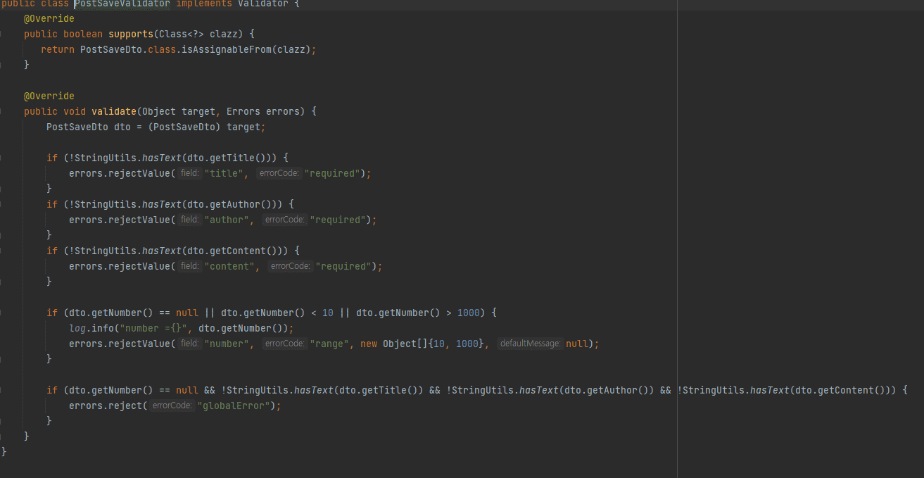 validator를 만들때 support에서는 saveDto 클래스로 설정하고 validate에서 받는 target의 다운캐스팅 자료형도 saveDto로 받았습니다