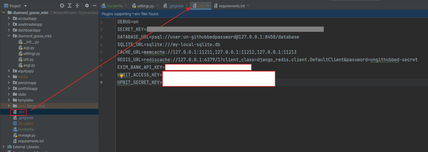 강좌에서는 .env 파일에 등록해서 쓰는 KEY가 django SECRET_KEY 하나인듯 한데요, 제가 만든 프로그램에선 각종 API를 받아오기 때문에 API별로 접속에 사용하는 KEY를 모두 .env 파일에 넣어놓고 프로젝트 디렉토리 settings.py에서 가져다가 쓰는 구조에요...