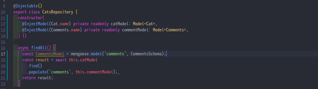 하지만 종종 mongodb에서 의존성 주입을 받았을때 라이브러리 이슈가 있을 수 있는데 이 경우 전역으로 사용되는 인스턴스를 사용하는 것이 좋습니다! comment 모델을 직접 불러오는 형태로 말이죠!
